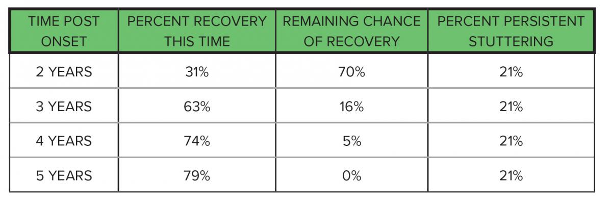 Also, from what the Illinois studies revealed about the rate and timing of natural recovery, it is quite probable that their sample missed about 30% of the potential population of early childhood stuttering, those who recovered during the first two years post onset (see Table 1). This consideration is also evidenced by their low natural recovery of only 44% as compared to nearly 80% when the sample includes younger children close to onset. The more time post onset, the smaller the natural recovery rate.