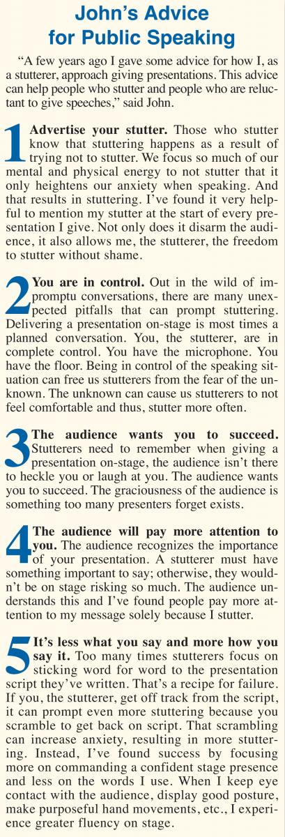 When speaking in public, John says there are two things he does at the beginning of every presentation. “I tell the audience two things about myself. First is my mantra: I take my job seriously, and myself lightly. And second, I tell the audience that I stutter, and it will happen during this speech. It is very disarming, and helps me form a bond with them immediately. It also puts me at ease, so I don’t have to worry about disfluency.