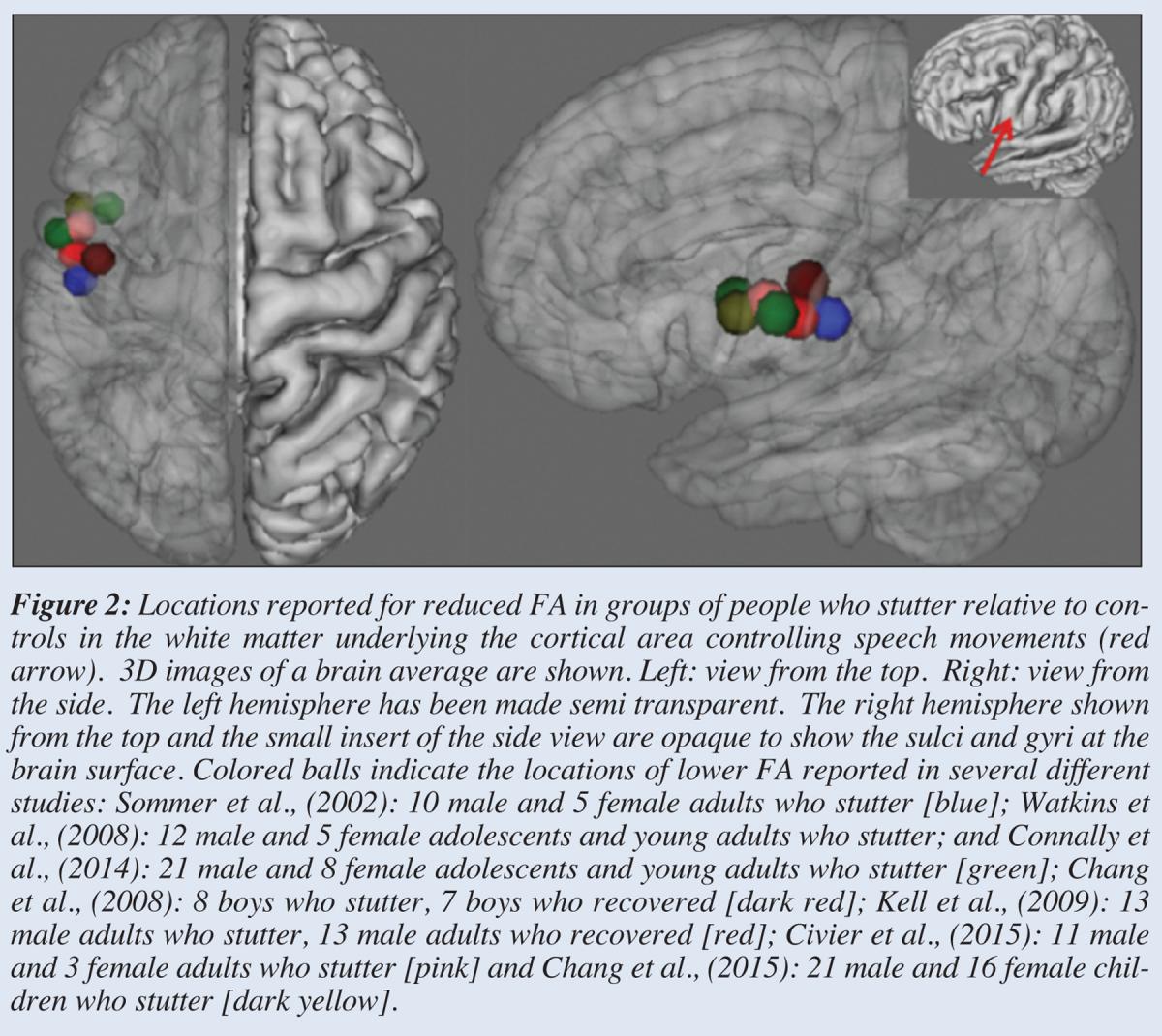 Many studies of stuttering used an MRI method called diffusion-tensor imaging to examine the organization of the white matter in the brain.  Diffusion MRI is able to determine the orientation of white matter fiber bundles by examining the movement of water. Water molecules diffuse easily in watery substances when there are no barriers to diffusion.  The cerebrospinal fluid that bathes the brain is very watery and diffusion is high in this substance and equal in all directions because there are no barriers. Imagine how quickly and completely a drop of blue ink would turn the water inside a coconut blue because diffusion in watery substances is high. Gray matter is more like the inside of an eggplant, diffusion is low in gray matter (and eggplants) because there is less water and there are lots of cell bodies, membranes and fibers to reduce the movement of water. In white matter, however, we see highly constrained diffusion due to the fiber bundles. These might be considered like the fibers inside a stalk of celery. These fibers would take up blue ink and it could move along them considerably more easily and quickly than across the grain of the celery stalk. In the white matter, it is similarly much easier for water to diffuse along the direction of the axon fiber bundles than across them.  This leads to a bias in the movement of water that is described by a mathematical ratio known as fractional anisotropy or FA. FA is high when water moves mainly in one direction – isotropy would indicate equal movements in all directions (like in coconut water or CSF). By measuring the diffusion of water in lots of different directions in all parts of the brain, we can guess at the organization of the underlying white matter structure and work out the direction in which axons are oriented within fiber bundles.