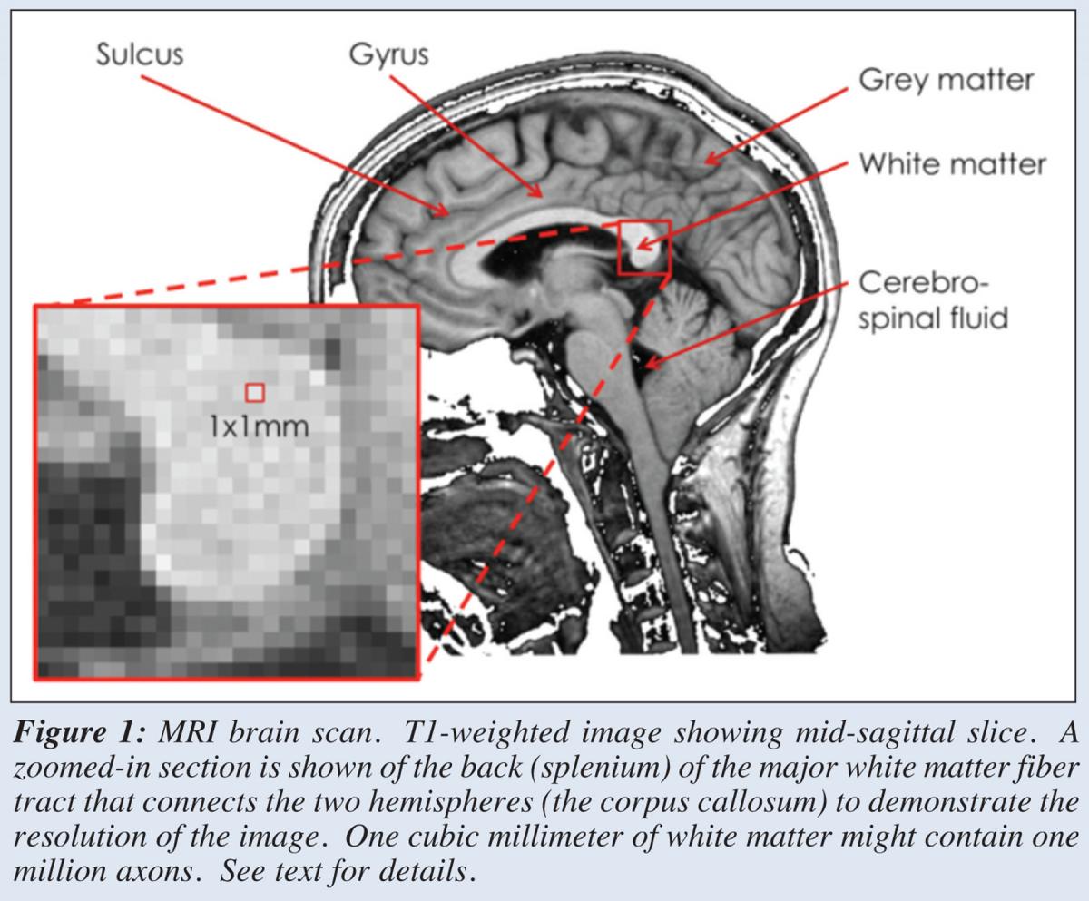 In almost every MRI study of the brain, researchers obtain an image like the one here that shows gray matter as gray, white matter as white and the skull and the cerebrospinal fluid, which bathes and supports the brain, as black (Figure 1). The scalp, muscle and fat tissue of the head also show up as varying shades of gray. The brain’s outer layer is cortex (like the bark of a tree) and contains the cell bodies of neurons, where the nucleus is located and which cause the tissue to look darker, hence gray matter. Gray matter is also found deeper in the brain where groups of cells form larger functional units also known (confusingly) as nuclei – for example, the basal ganglia nuclei are subcortical gray matter structures that when diseased cause movement disorders such as Parkinson’s disease. In between the cortex and the subcortical nuclei lies white matter. This contains bundles of fibre that carry axons from cell bodies in gray matter to communicate with neuron elsewhere in the brain or in the spinal cord.  The reason white matter is white is because the axons are typically sheathed in a fatty substance called myelin, which improves the speed at which they conduct signals.