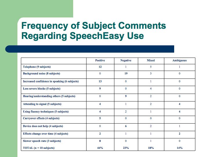 At the end of the study, subjects were then surveyed in order to gain insight as to their satisfaction with wearing the SpeechEasy. Regarding ultimate purchasing decision, four of the 11 subjects who began the experiment elected to purchase their devices at a substantial discount after completing the study. Three subjects did not purchase the device, but replied that they would continue to use the SpeechEasy if it were given to them free of charge. A final three subjects decided not to buy the device and reported that they would not continue to use it even if it were given to them at no charge.
